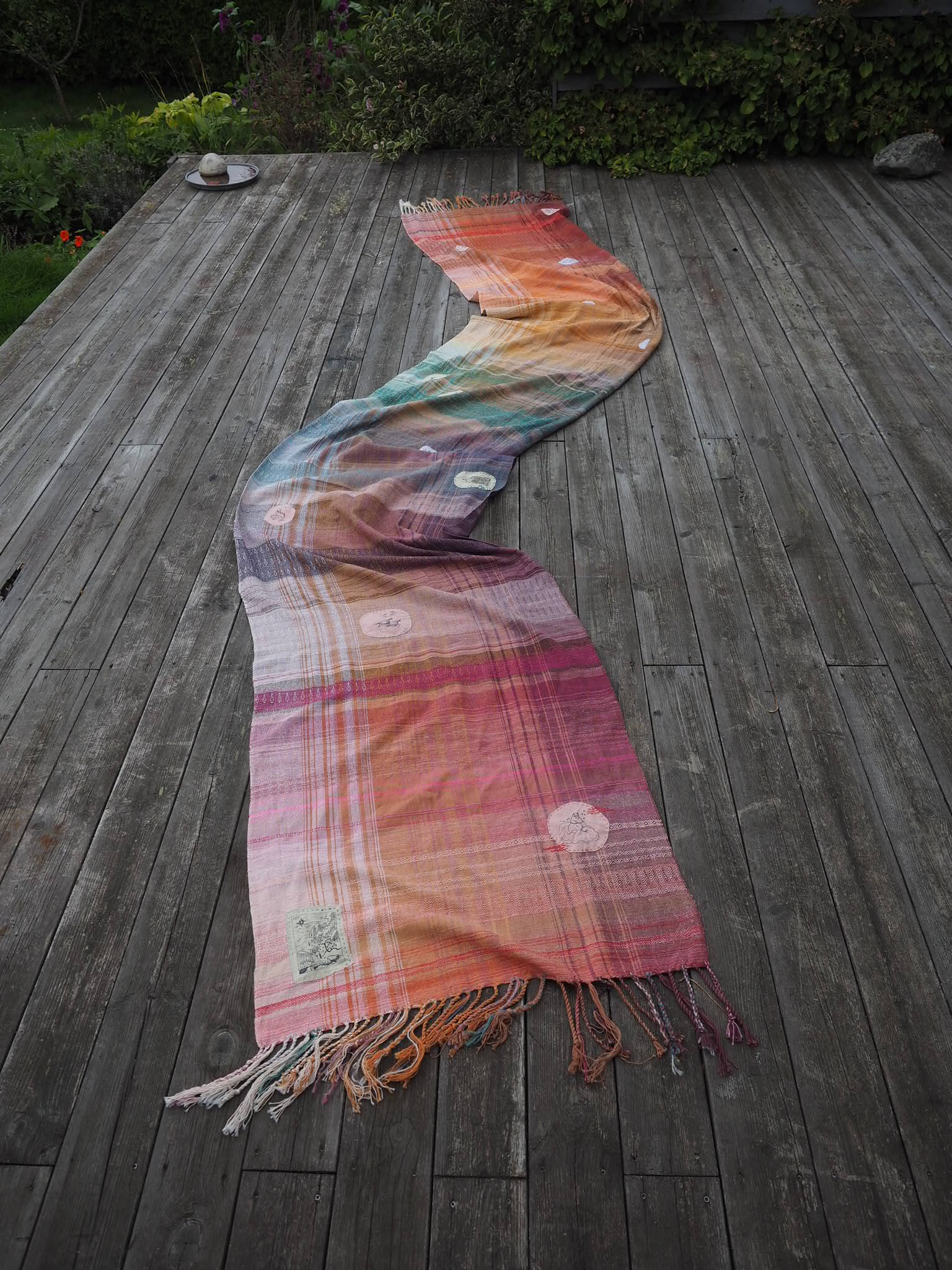 Teknikk: Utover å håndfarge garnet, spinne ull og veve, har jeg tegnet motiver fra Mummidalen med tekstilpenn, og forsøkt å holde dem enkle i uttrykk. Jeg har en forkjærlighet for lappetepper, å sy tålmodig for hånd sammen de siste brukbare restene av noe som er for slitt til å bli noe annet. Så jeg har sydd på tegningene som lapper gjennom sjalet, med ulike håndsømteknikker.
