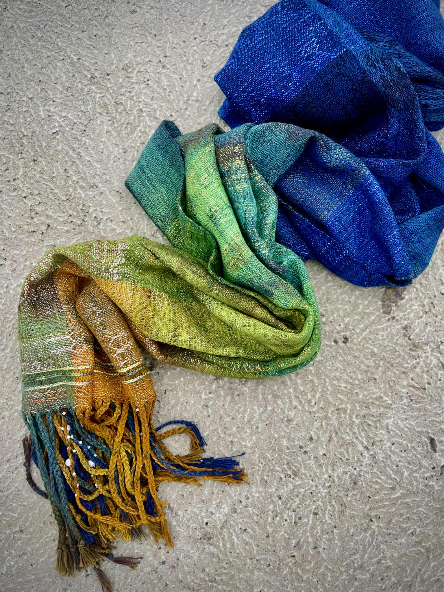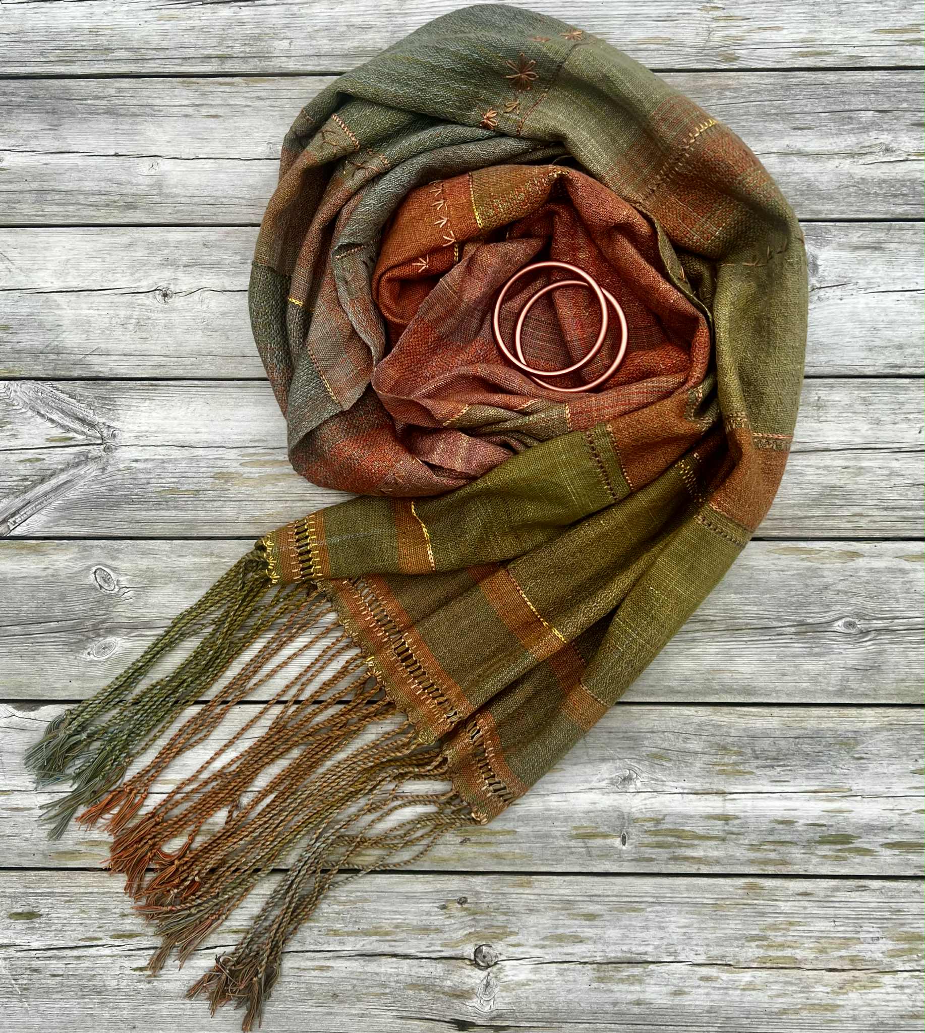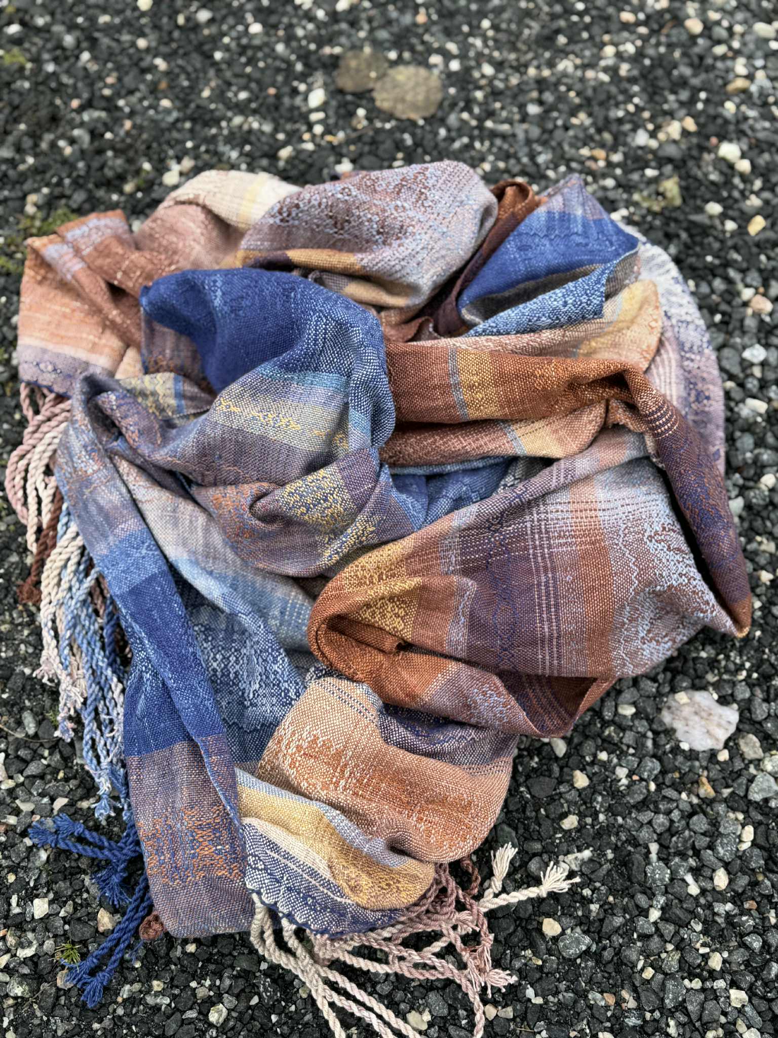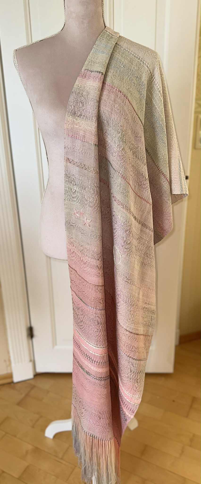 Blend: Håndfarget bomullsrenning. Innslaget er en blanding av håndfarget bourette silke, tsumugi silke, økologisk bomull og cottolin. Frynsene har håndsunnet ull og silke kombinert med renningsgarnet.