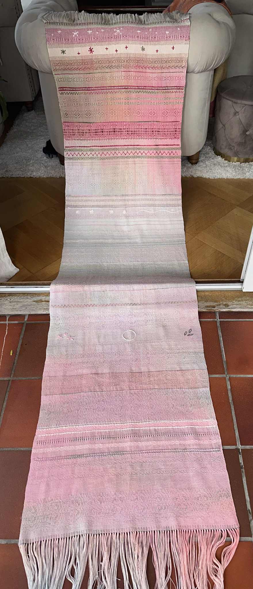 Lace på frynseenden med noen fletter (soumak). Perler flettet inn i noen av frynsene for å representere de hvite sandbankene og alle skjellene i Taremareby.